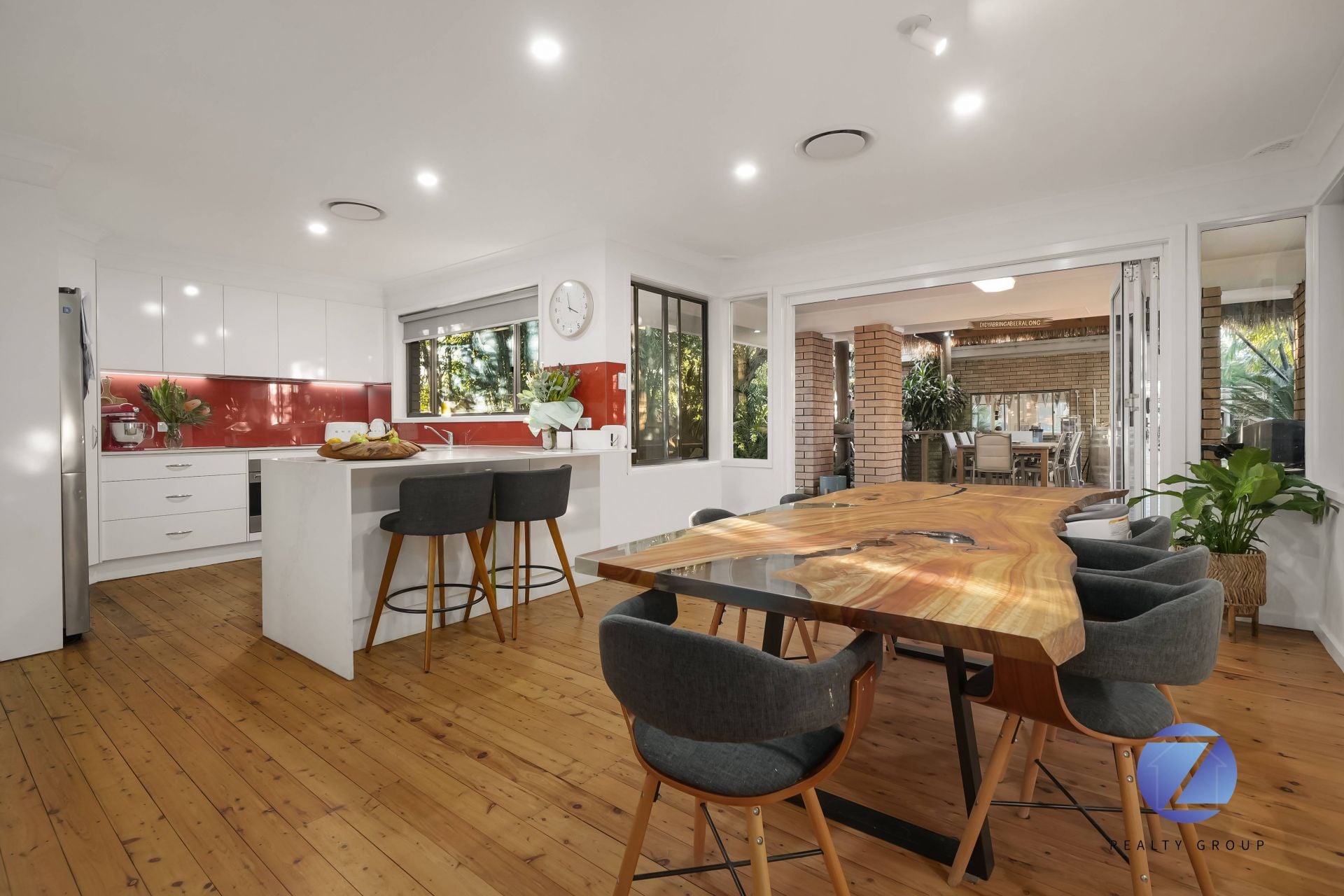 * State of the art modern kitchen, 20mm stone benchtops with waterfall & glass splashback. There are bi-fold doors that allows the internal floorplan to intertwine into the rear oasis – and that pitched roof pergola with timber deck.