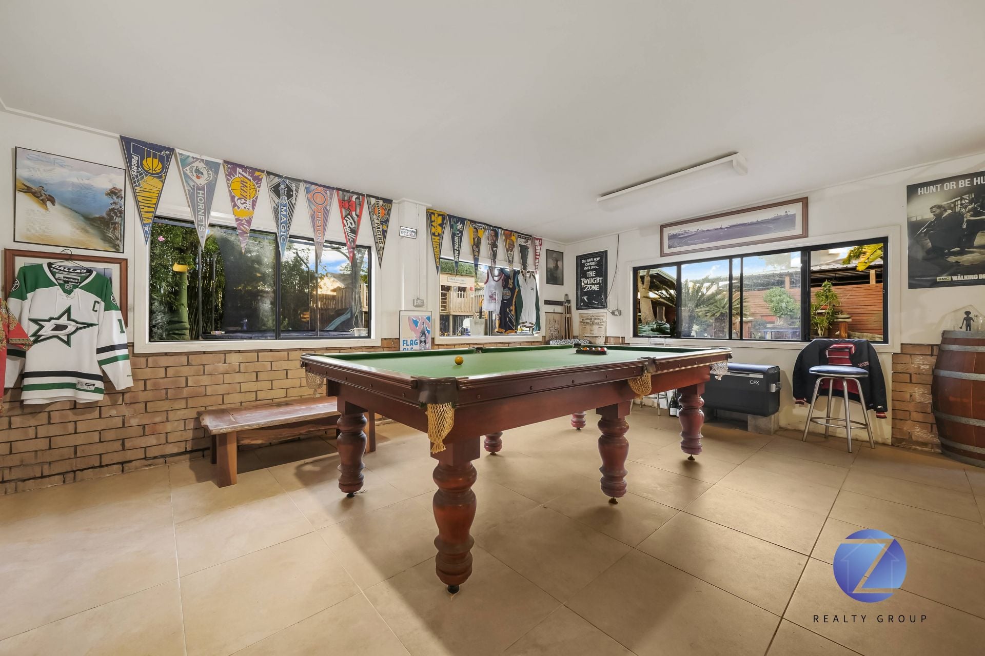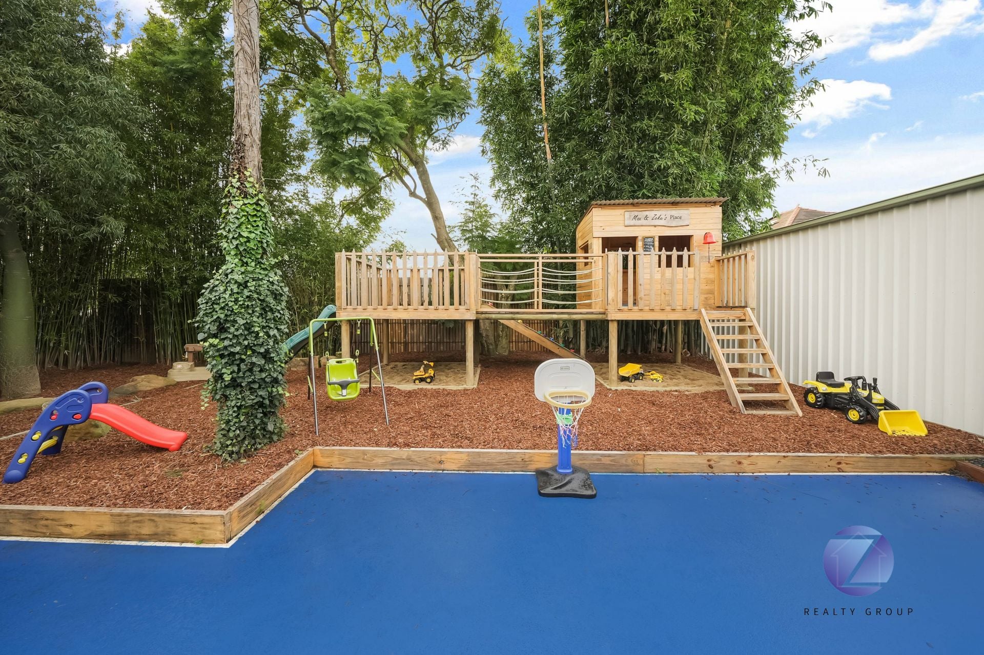 A detached Colourbond double garage, with carport. A man-cave which is just the spot for a cold refreshment and a game of pool. Then there is that half sized basketball court with the customized children's cubbyhouse overlooking it, this just completes the external package.